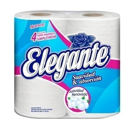 Papel higiénico Elegante por cuatro unidades simple hoja. Nueva textura ultra suave y absorbente.